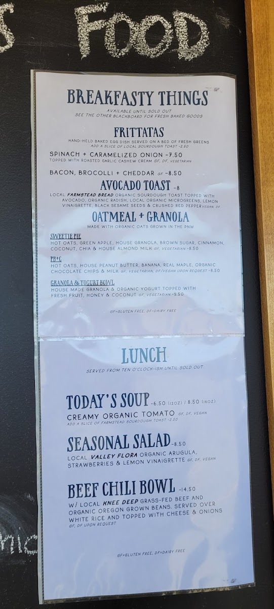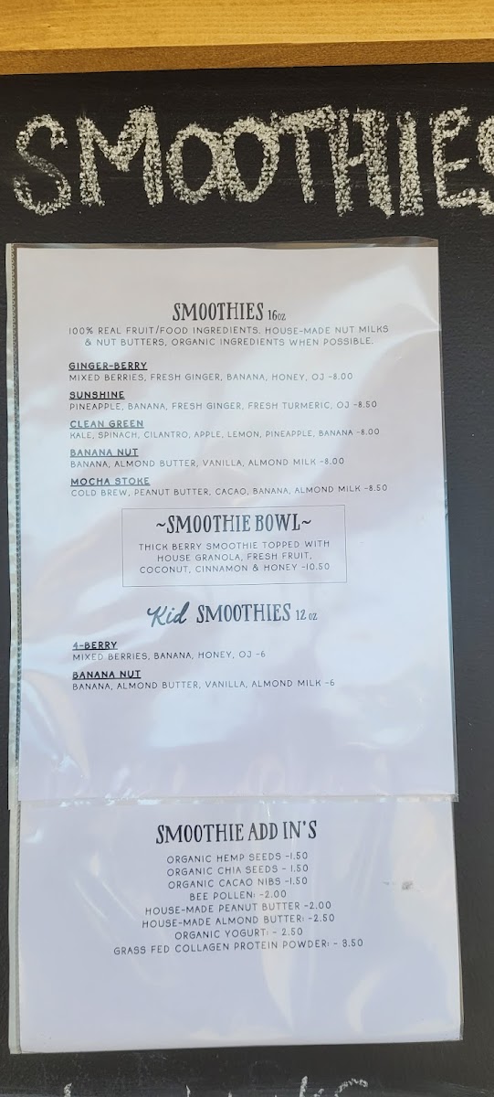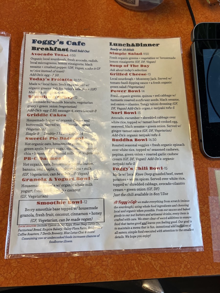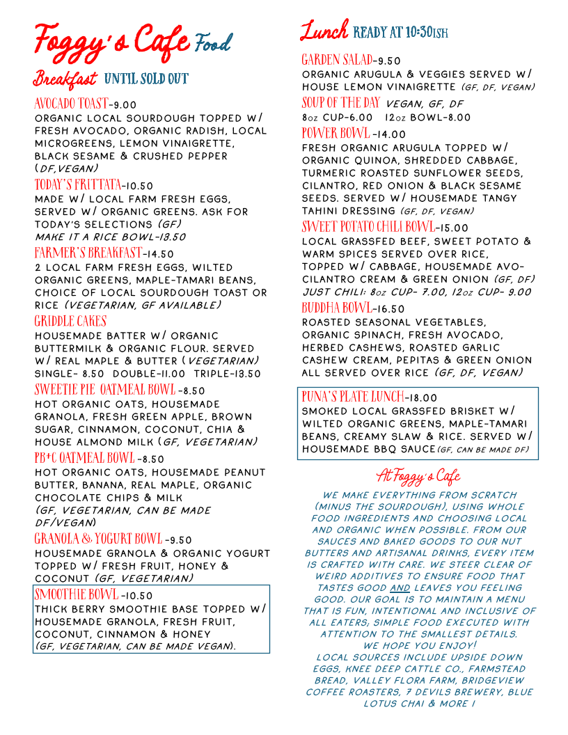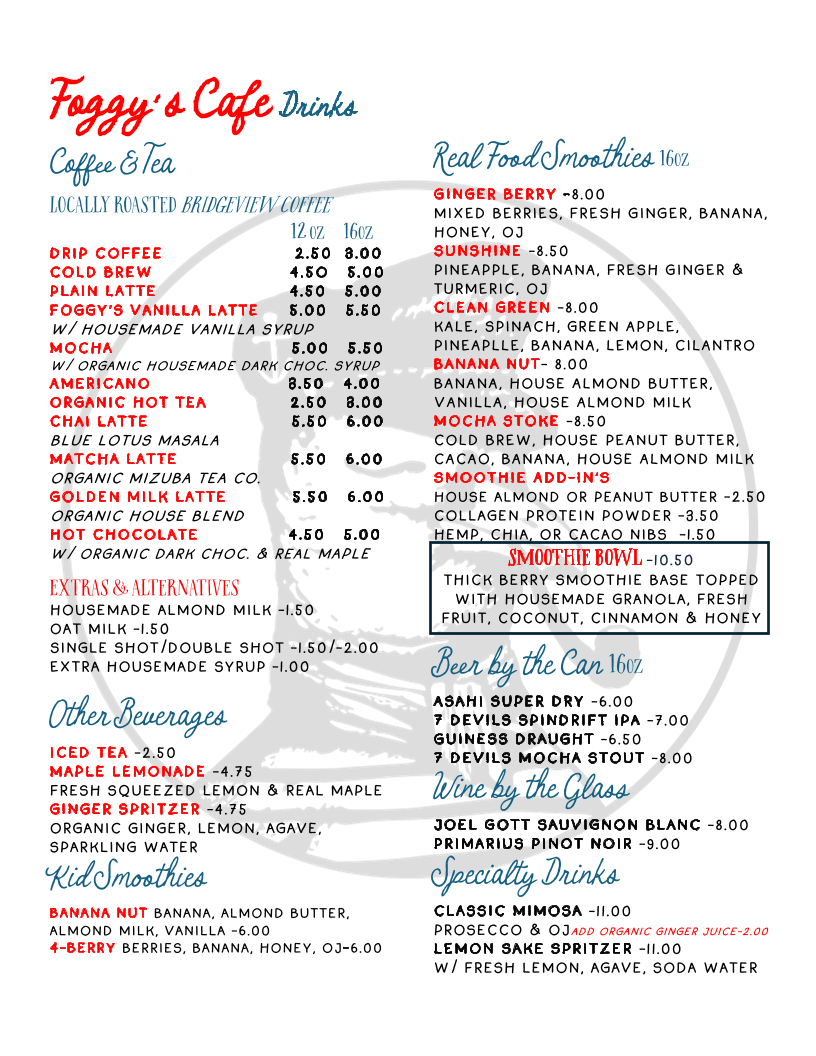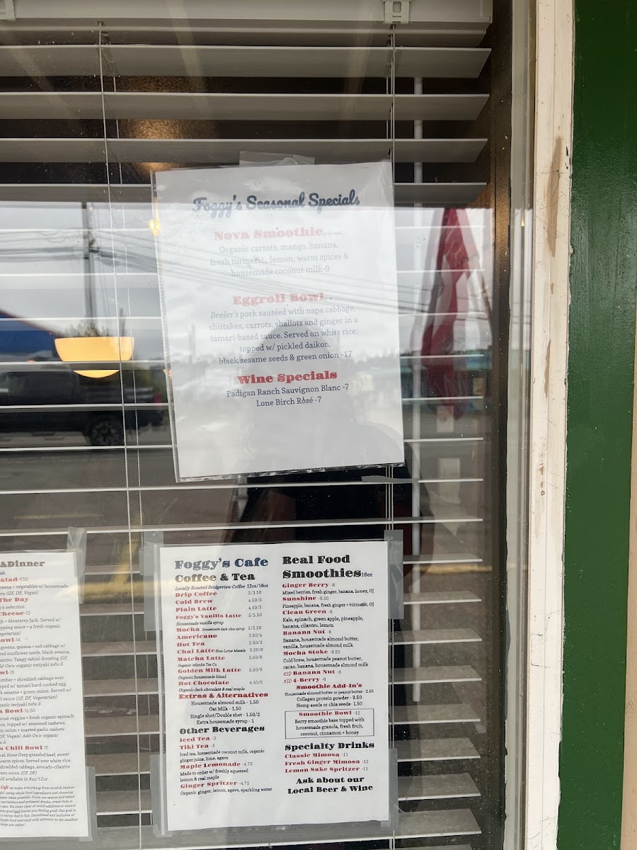 From a reviewer’s perspective, the menu at Foggy’s Cafe offers a thoughtfully curated mix of refreshing drinks and comforting breakfast options, even if specific prices aren’t listed. The beverage selection stands out with unique choices like Iced Tea, Maple Lemonade, and the vibrant Fresh Squeezed Lemon & Real Maple Ginger Spritzer, alongside kid-friendly options such as Banana Nut and 4-Berry smoothies. For a more nourishing boost, the Ginger Berry, Sunshine, Clean Green Banana Nut, and Mocha Stoke smoothies deliver both flavor and substance. Coffee lovers are well catered to with staples like Drip Coffee, Cold Brew, Latte, Mocha, and Americano, plus specialties like Foggy’s Vanilla Latte. The breakfast menu, available until sold out, features satisfying plates such as Avocado Toast and Farmer’s Breakfast, complemented by hearty Frittatas like Spinach Caramelized Onion, Bacon, and Broccoli Cheddar. Lighter options like Sweetie Pie Oatmeal and the Granola & Yogurt Bowl add balance, while extras like House-Made Almond Milk and add-ins such as Grass Fed Collagen Protein Powder allow for customization. Overall, the menu feels fresh, wholesome, and diverse, making it an appealing stop for both quick bites and relaxed mornings.